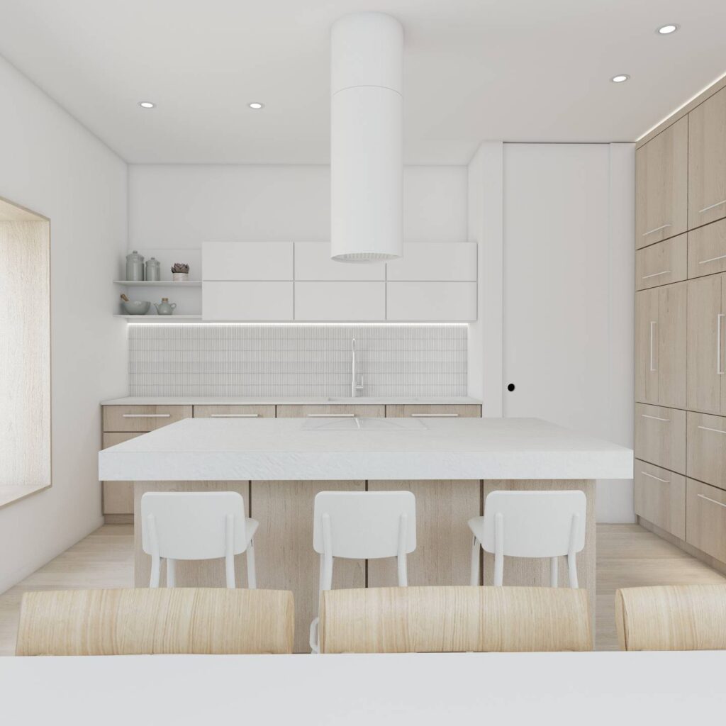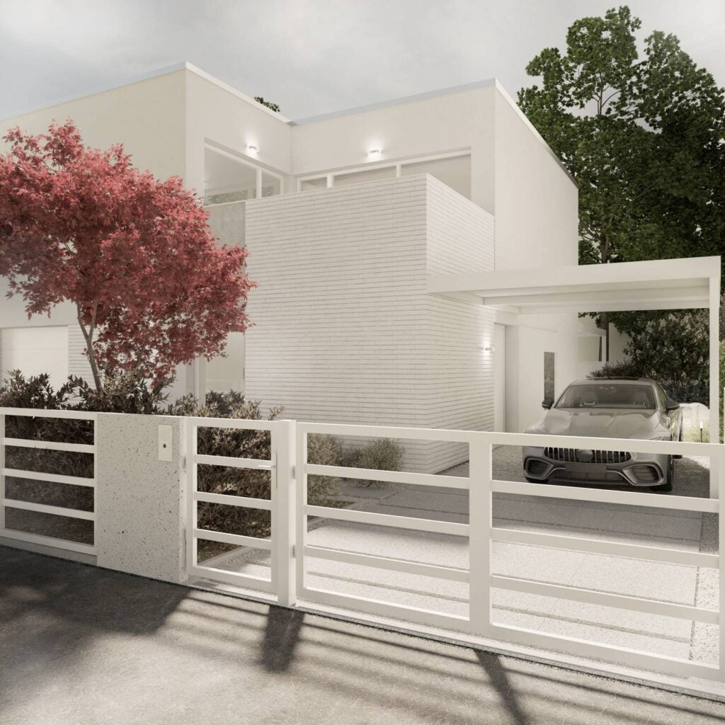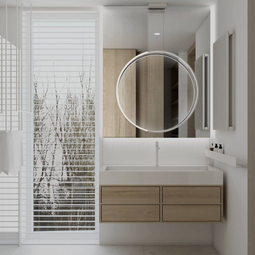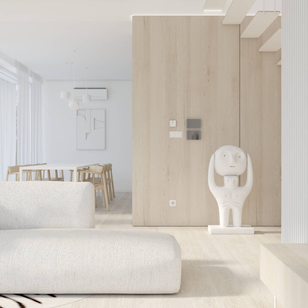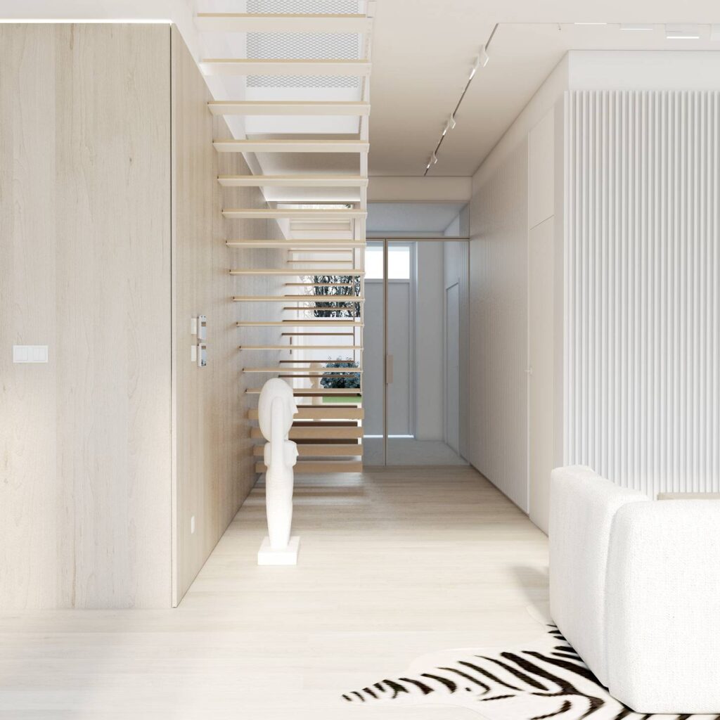 Wnętrze pozostaje w pełnej harmonii z architekturą – dominuje biel, rytm, faktury. Dla inwestorów szczególnie istotna była spójność estetyczna, jakość materiałów oraz precyzyjne opracowanie każdego elementu. Powstał dom minimalistyczny, w którym esencją są proporcje, światło i detale.