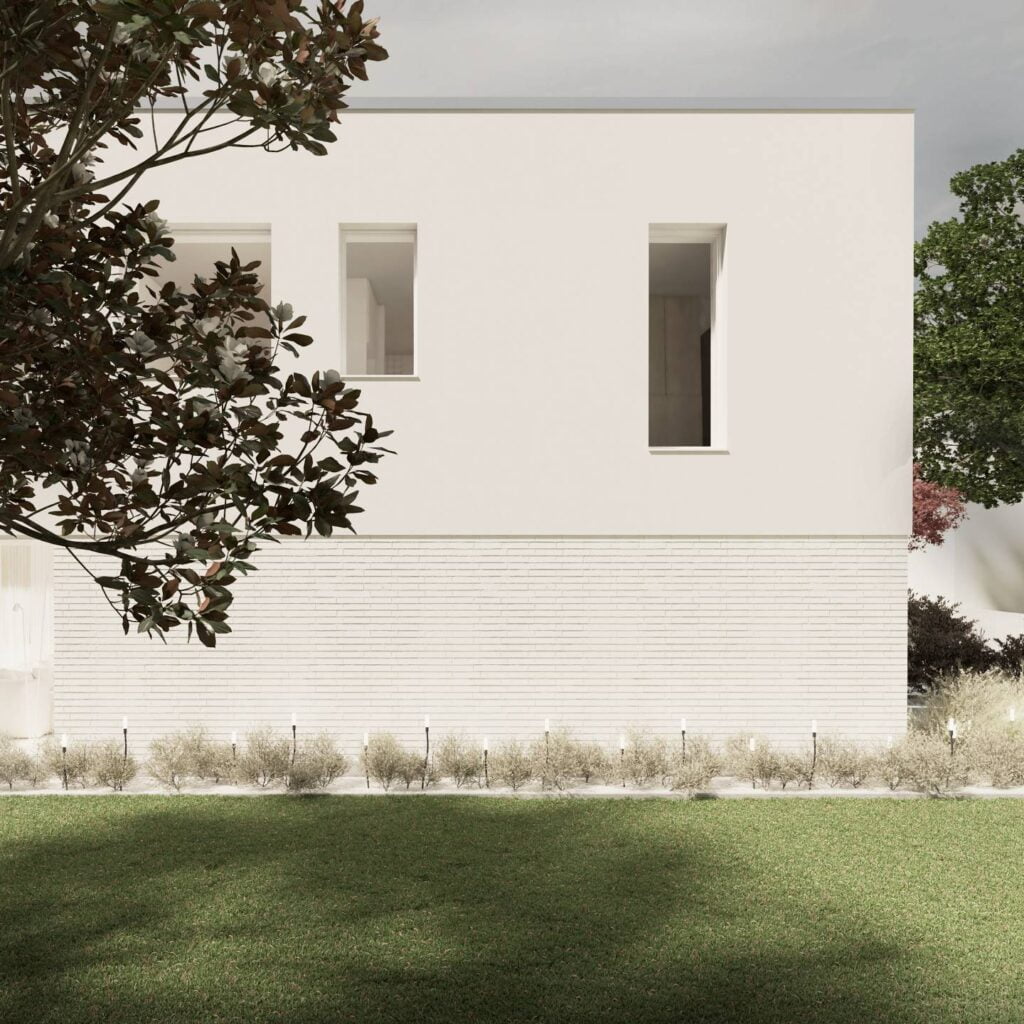 Zaprojektowaliśmy zwartą, minimalistyczną bryłę z jednym wycięciem, które porządkuje kompozycję i nadaje jej charakter. Elewacja została przełamana kontrastem faktur: gładki biały tynk w kontrze do strukturalnego klinkieru, tworzy subtelną grę światła i cienia. To właśnie światłocień, zmieniający się w ciągu dnia, dodaje budynkowi plastyczności i sensualnego wymiaru.