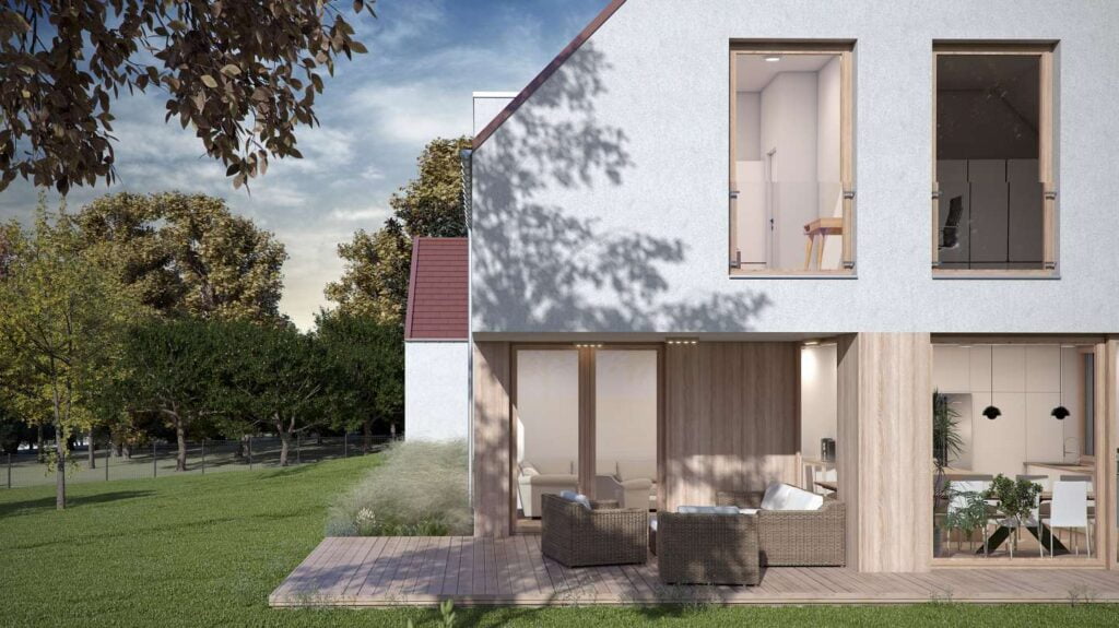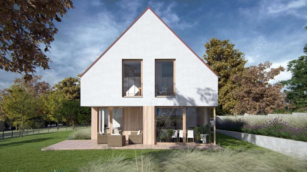 Dom otacza duży, zielony ogród, który podkreśla sielski charakter miejsca. W podcieniu budynku zaprojektowano taras, będący naturalnym przedłużeniem strefy dziennej. Całość wyróżnia się spokojną, harmonijną architekturą, inspirowaną wiejską tradycją Dolnego Śląska.