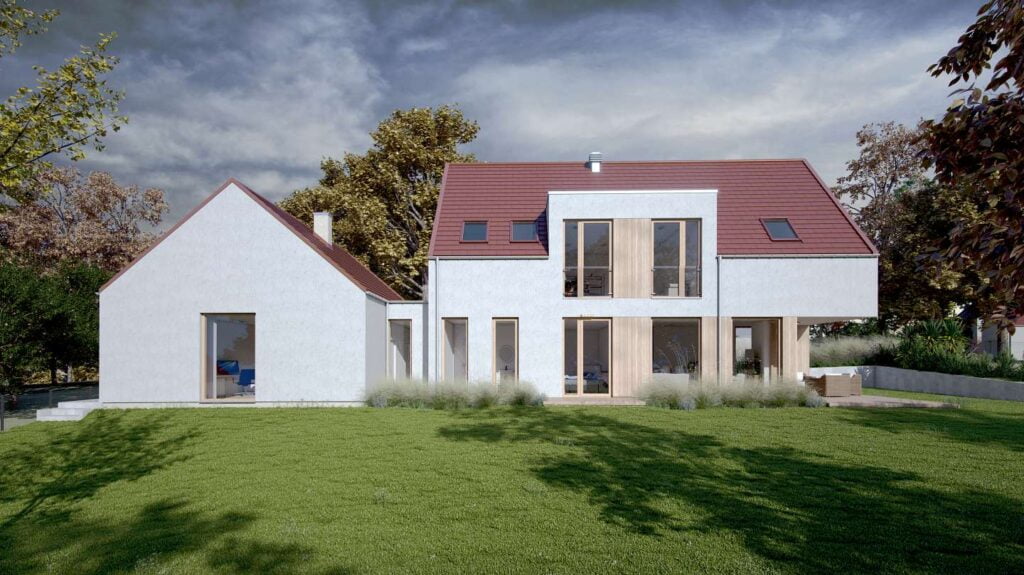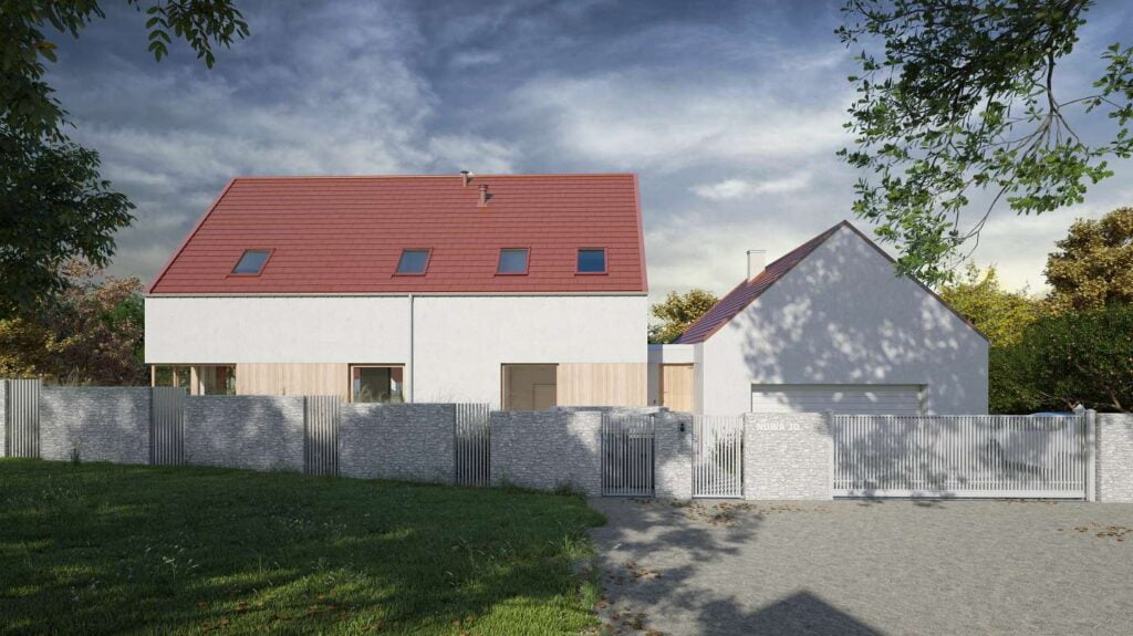 Nowoprojektowany dom wpisuje się w poniemiecką architekturę regionu poprzez zastosowanie prostych, archetypicznej form z dwuspadowymi czerwonymi dachami oraz jasnej elewacji. Budynek tworzą dwie bryły – większa z strefą mieszkalną oraz mniejsza o funkcji gospodarczej z niewielkim lokalem fizjoterapeutycznym. Obie części połączone są przeszklonym łącznikiem, który jednocześnie pełni funkcję strefy wejściowej.