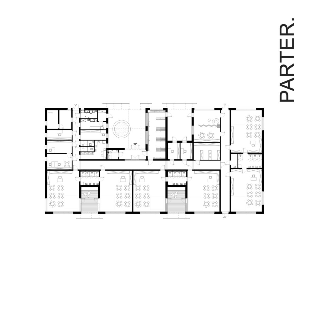 Forma obiektu opiera się na koncepcji prostopadłościennej bryły z płaskim dachem. Jednolita forma została przełamana czterema dynamicznymi wycięciami, które tworzą kameralne, wewnętrzne dziedzińce. Największe z nich, po stronie północnej, pełni funkcję reprezentacyjnej strefy wejściowej.