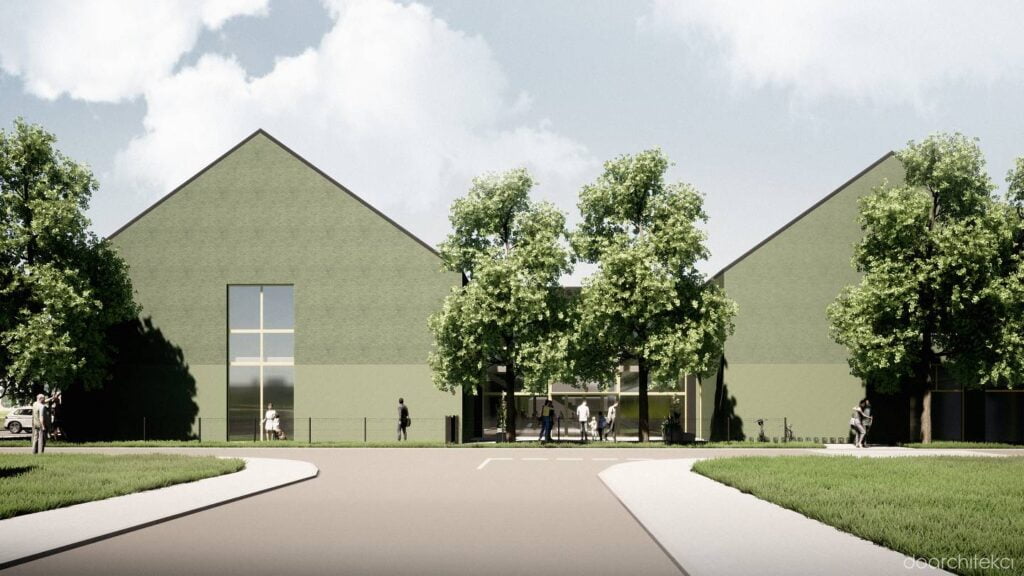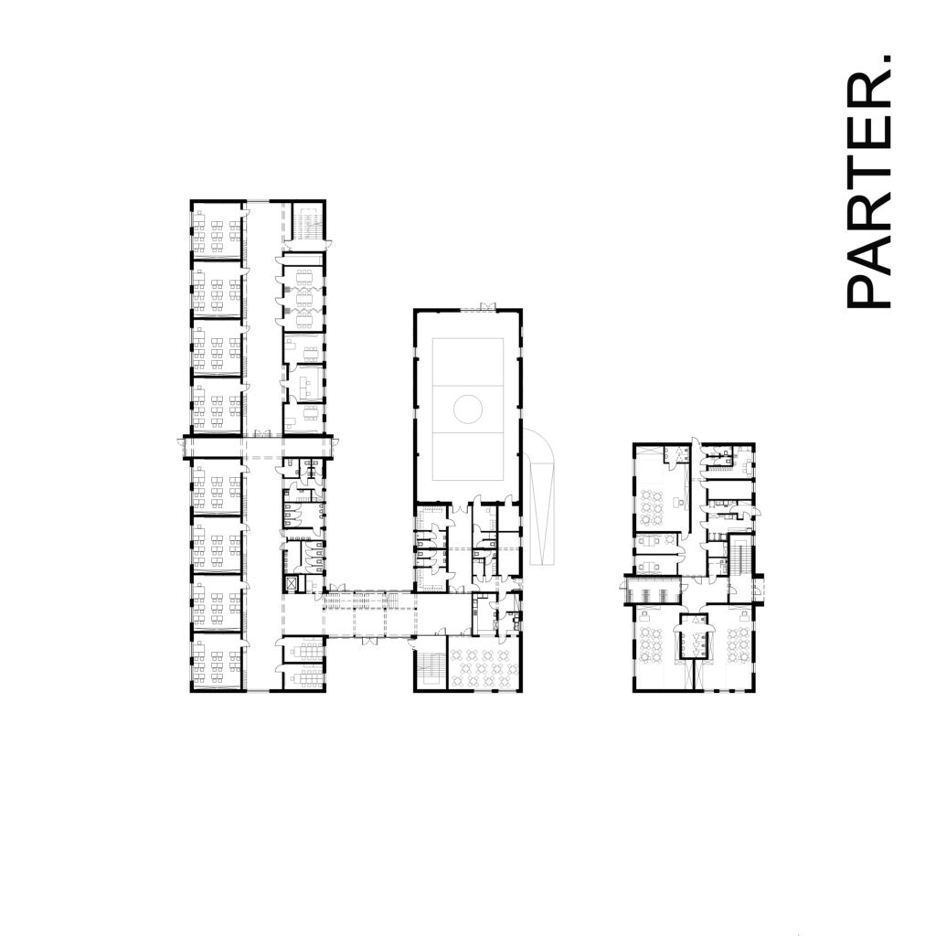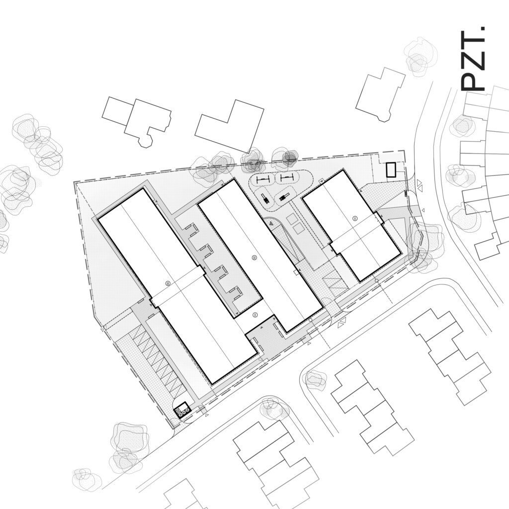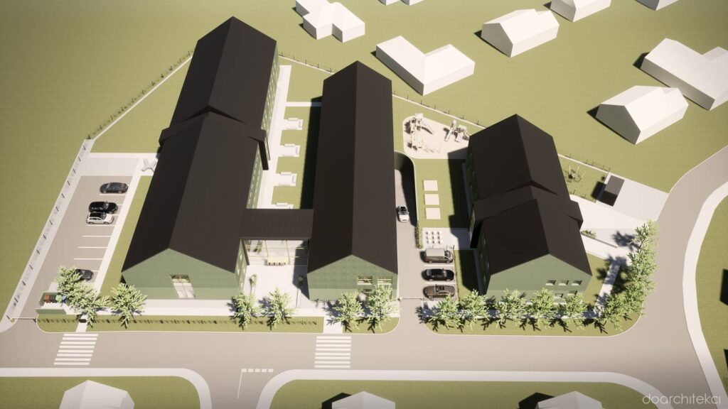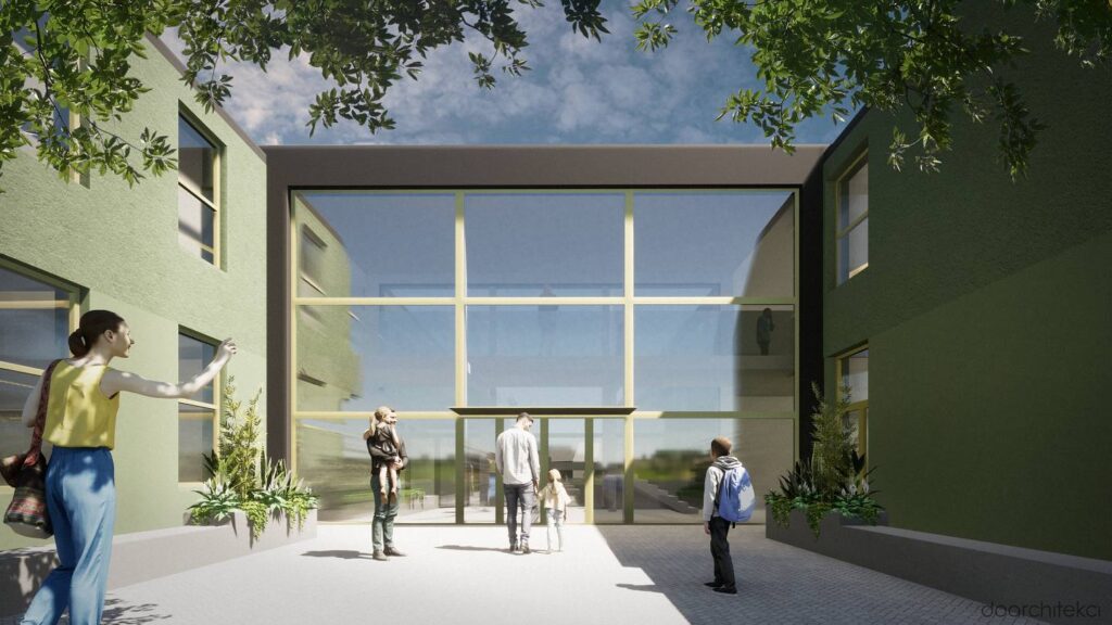 Koncepcja projektowa dotyczy nowoczesnego kompleksu edukacyjnego zlokalizowanego w sercu osiedla domów jednorodzinnych w okolicach Wrocławia. Układ urbanistyczny opiera się na trzech prostopadłościennych bryłach z dwuspadowymi dachami, ustawionych równolegle, co tworzy spójną i harmonijną kompozycję. Stopniowe wydłużanie budynków nadaje im dynamiczny, schodkowy układ.